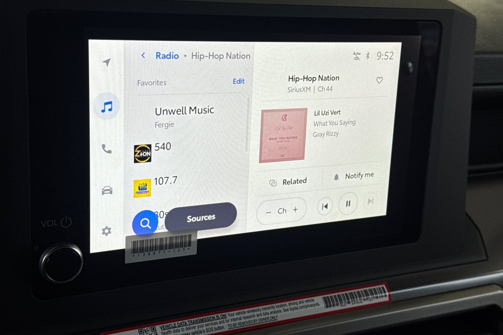 11. Apple CarPlay® requires a compatible iPhone® with an active data plan. Check compatibility at https://www.apple.com/ios/carplay/. Operability depends on network availability, a cellular connection and GPS signal. Services vary by vehicle and are subject to change at any time without notice. Data charges may apply. To learn more, go to https://www.toyota.com/audio-multimedia/. To learn more about Toyota Connected Services data collection, use, sharing and retention practices, please visit https://www.toyota.com/support/privacy-notice/. Apple CarPlay® is a registered trademark of Apple Inc.